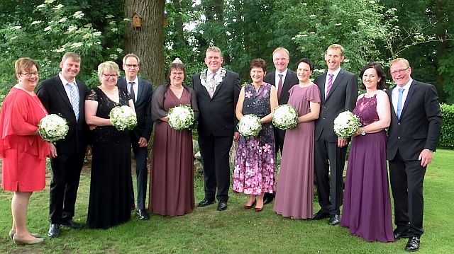 v.l.n.r.: Wilfried Kröger und Gerda Herbers, Heiner und Mechthild Thole, Werner und Marion Alves, das Königspaar Gerd und Ulla Schöttmer, Alfons und Marlene Schulten, Andreas und Hildegard Eilers sowie Mario Fels.